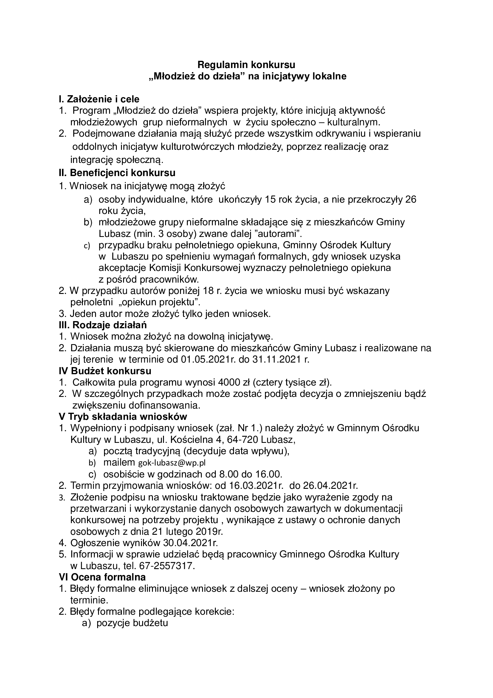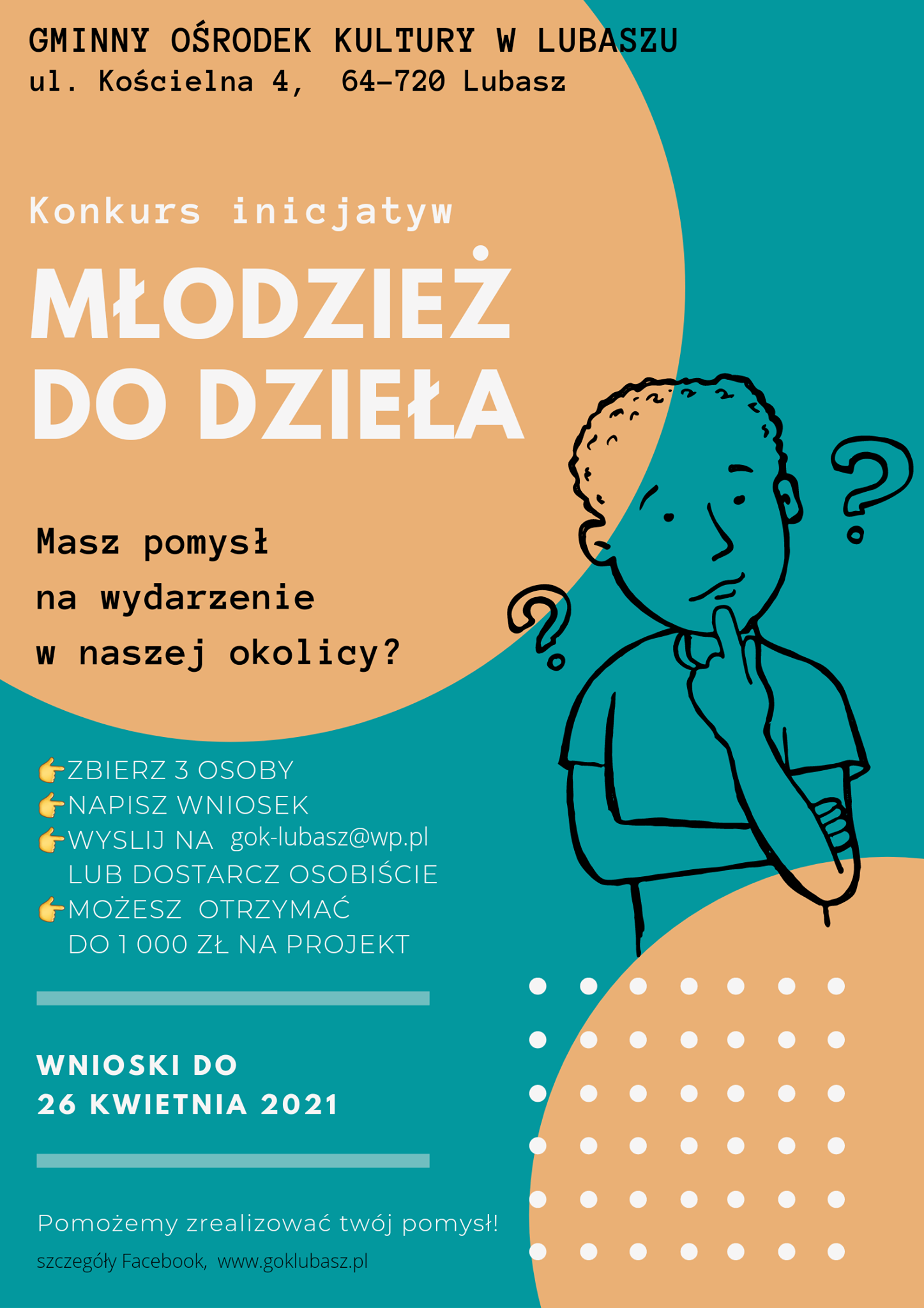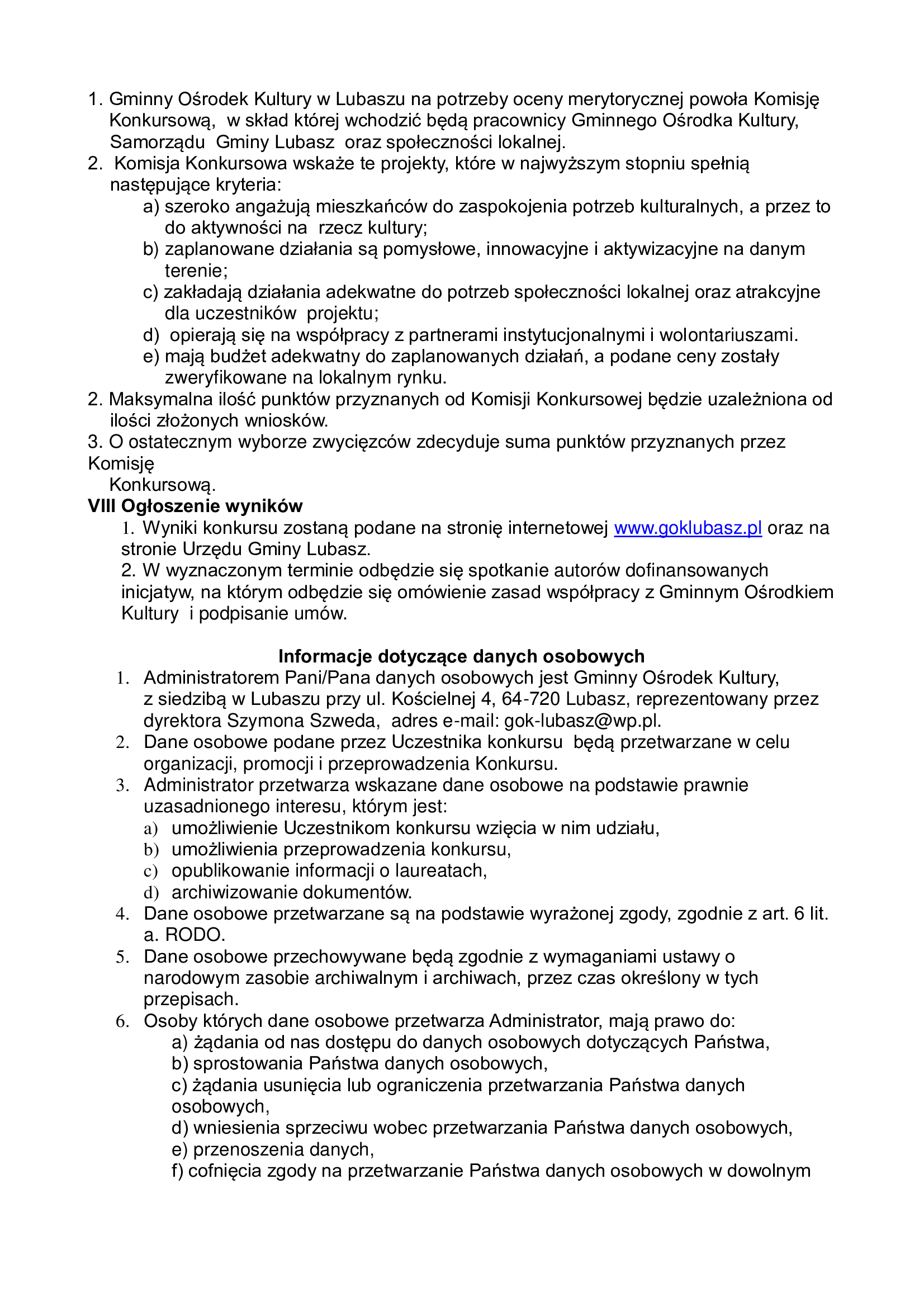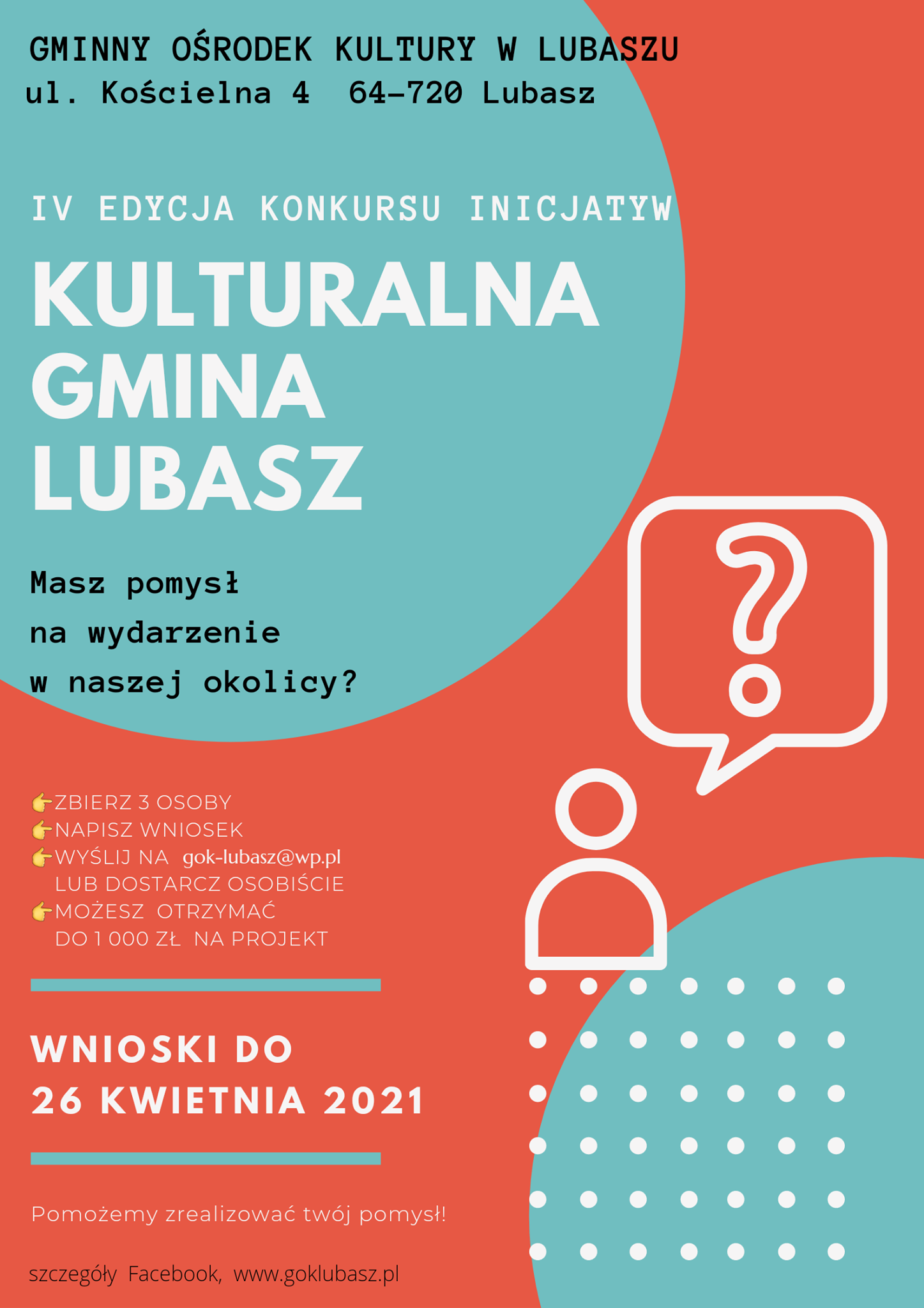 podejmowane działań mających służyć przede wszystkim odkrywaniu i wspieraniu oddolnych inicjatyw kulturotwórczych młodzieży i mieszkańców Gminy Lubasz poprzez realizację oraz integrację społeczną.