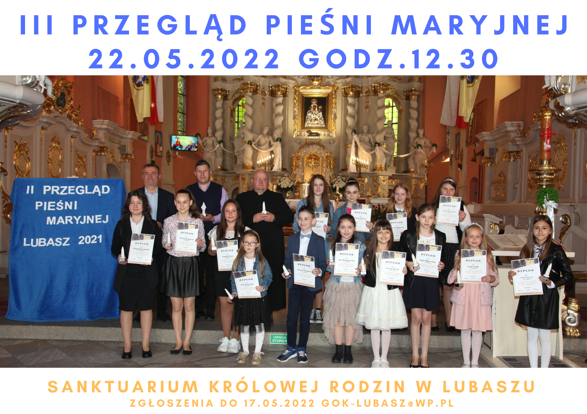 zapraszamy na wyjątkowe wydarzenie "Przegląd Pieśni Maryjnej", które odbędzie się już po raz trzeci w Sanktuarium Królowej Rodzin w Lubaszu.