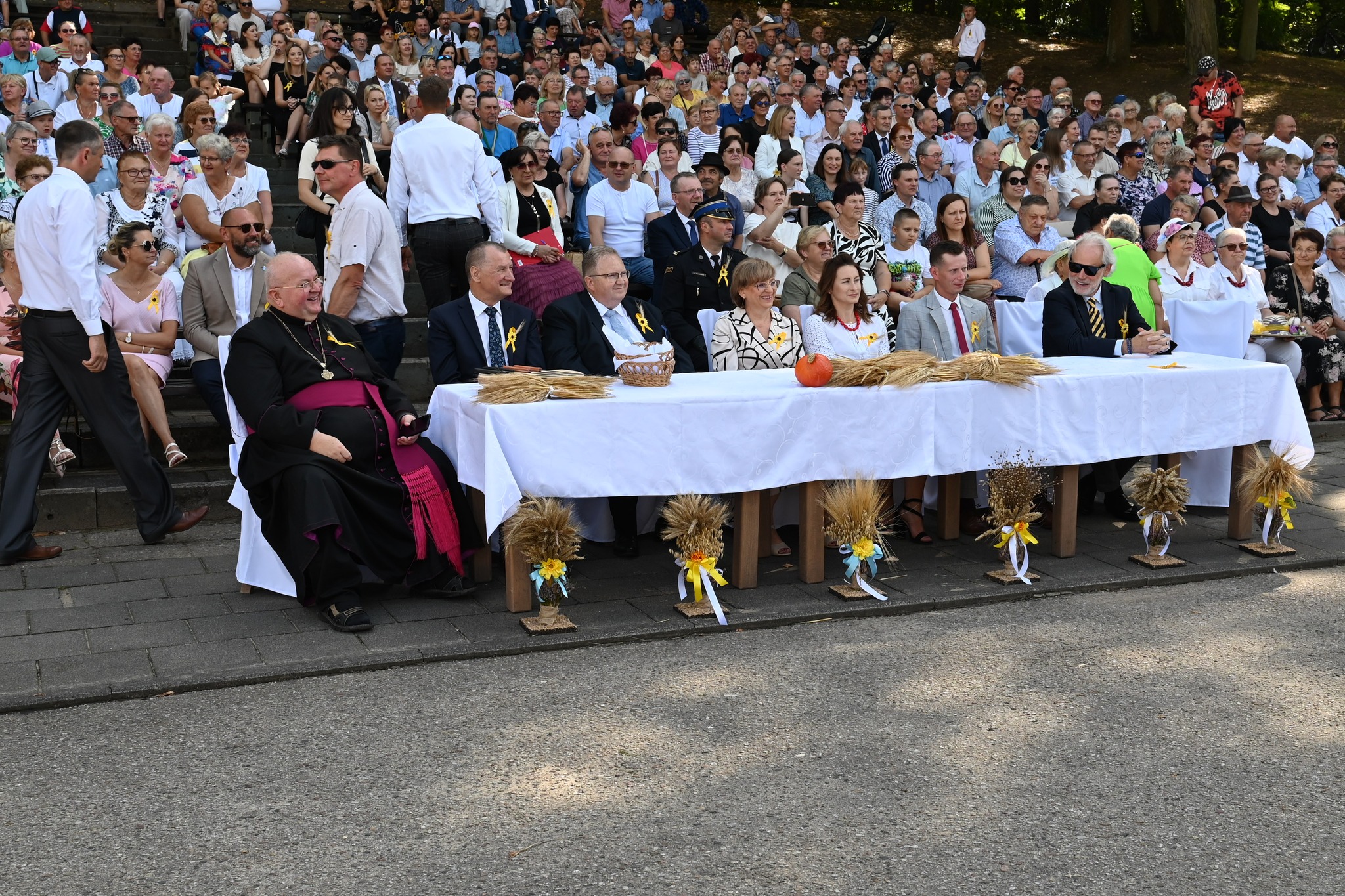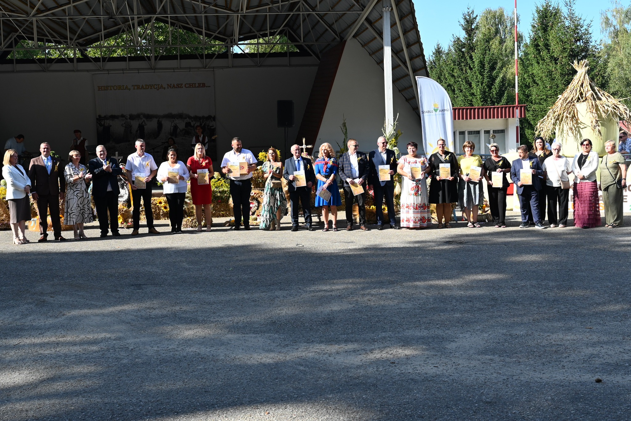 W amfiteatrze swoje dzieła zaprezentowało 15 sołectw. Każde z nich przygotowało wieniec dożynkowy – symbol urodzaju, wspólnoty i wdzięczności za zebrane plony. Konstrukcje zachwycały misternością i bogactwem form: od klasycznych koron z kłosów zbóż po bardziej fantazyjne kompozycje zdobione owocami, kwiatami i warzywami.