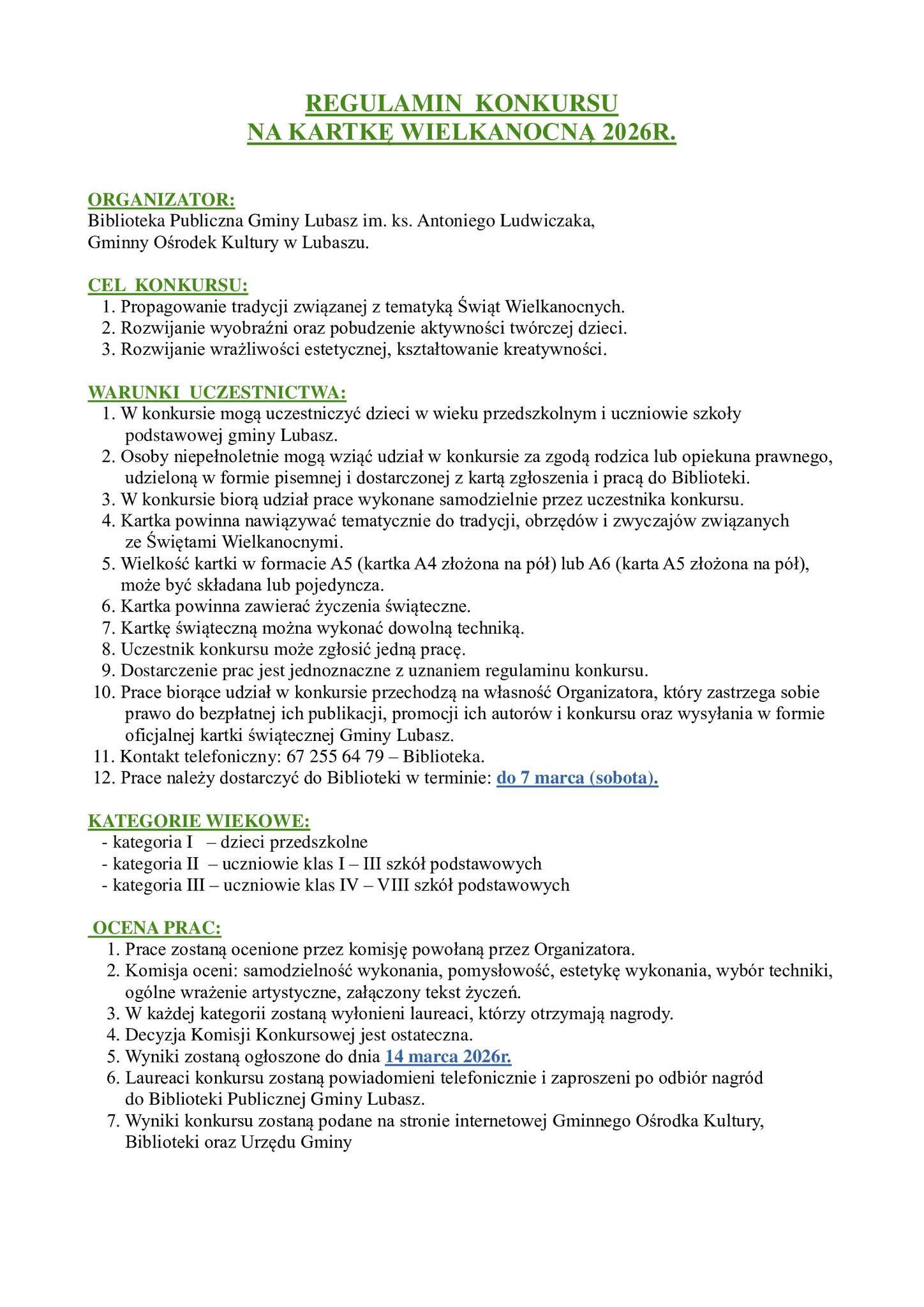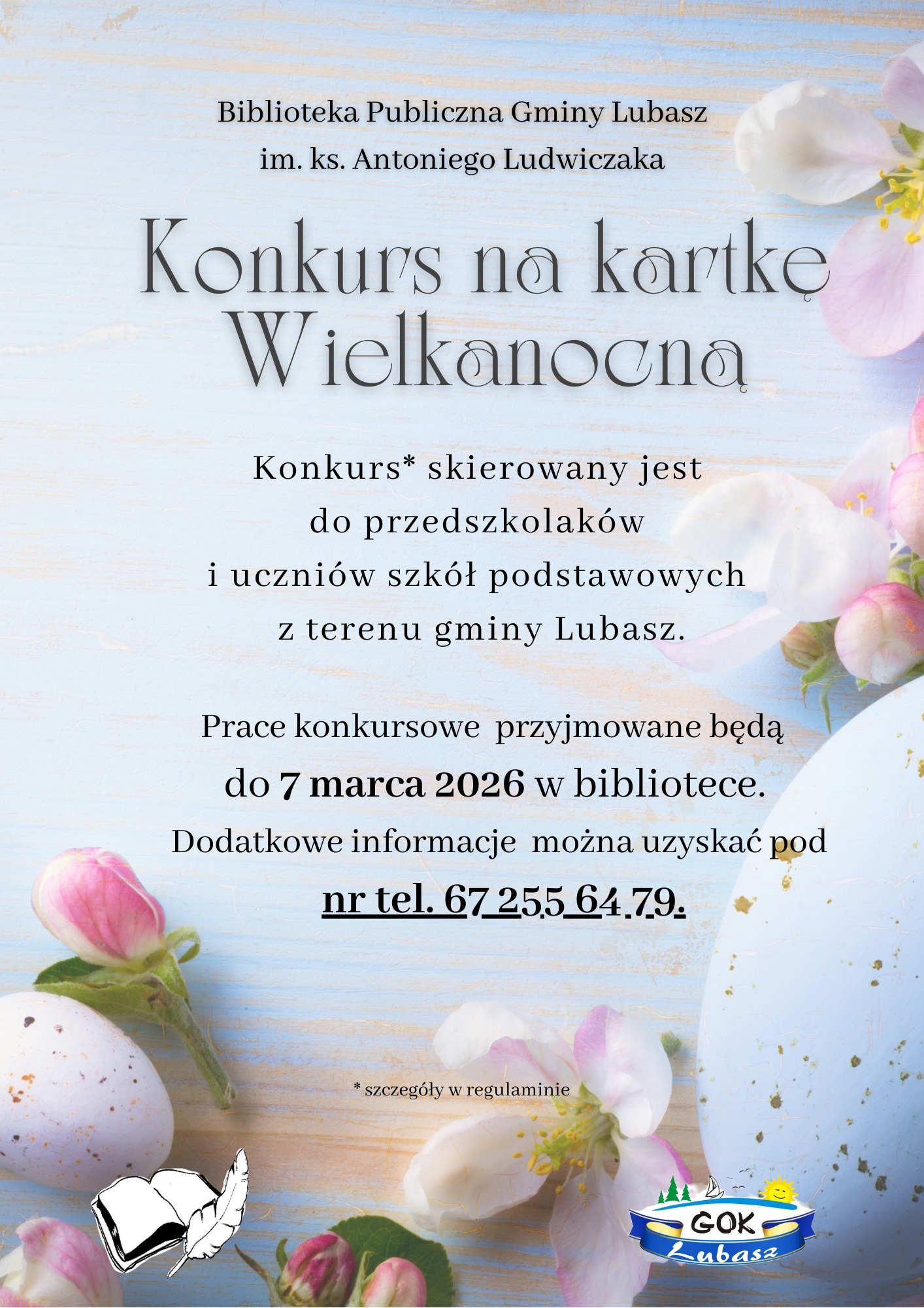 Szczegóły dotyczące terminów i zasad konkursu dostępne są w Bibliotece Publicznej Gminy Lubasz oraz na jej profilu.
