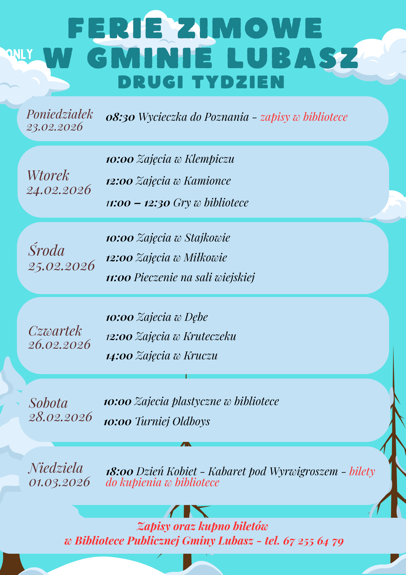 Gminny Ośrodek Kultury w Lubaszu przygotował atrakcyjną ofertę feryjnych zajęć dla dzieci i młodzieży. W programie znajdą się różnorodne aktywności, które pozwolą twórczo i aktywnie spędzić zimowy czas w miłej atmosferze
