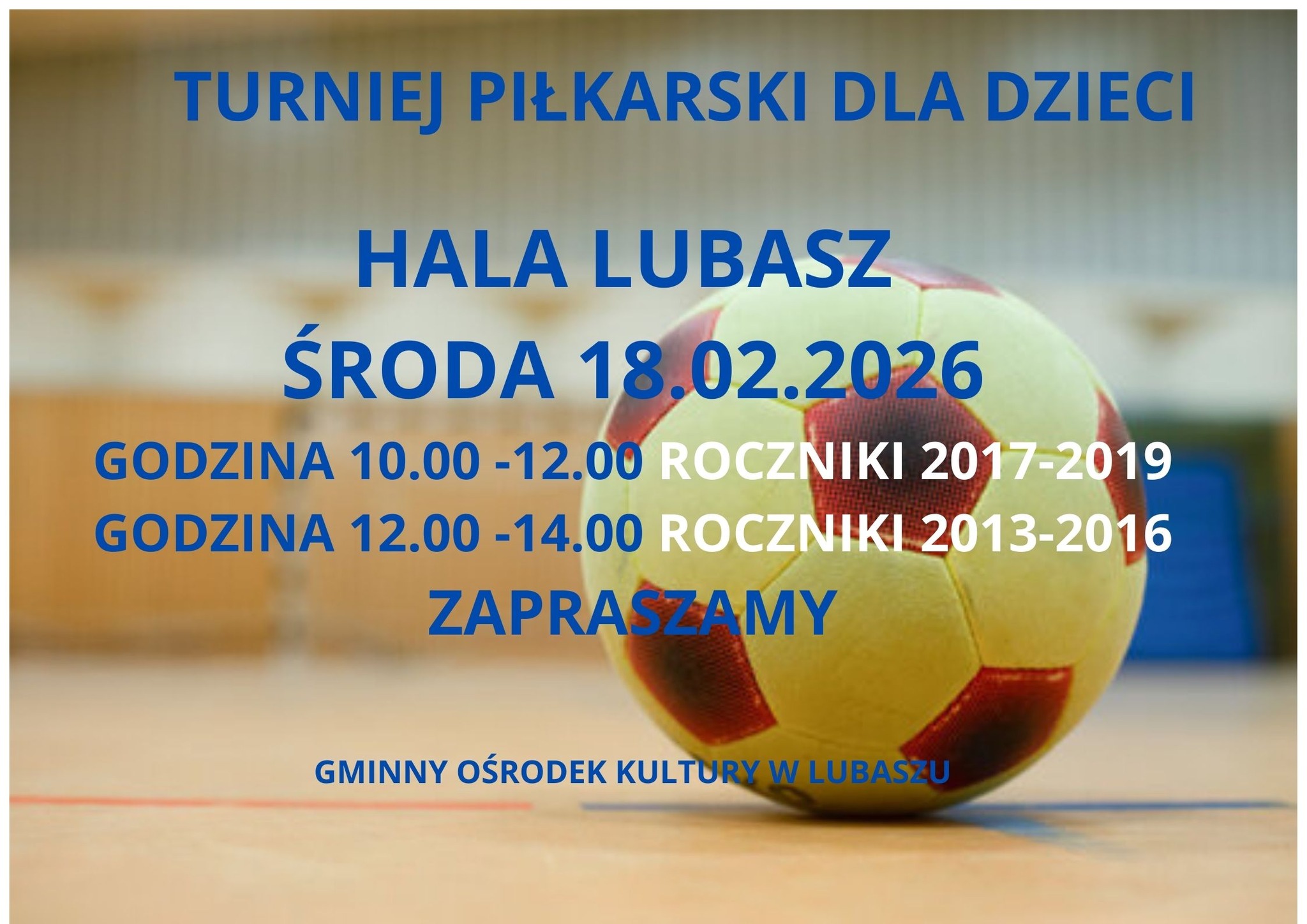 16/02/2026 TURNIEJ PIŁKARSKI DLA DZIECI TURNIEJ PIŁKARSKI DLA DZIECI HALA LUBASZ ŚRODA 18.02.2026 GODZINA 10.00 -12.00 ROCZNIKI 2017-2019 GODZINA 12.00 -14.00 ROCZNIKI 2013-2016 ZAPRASZAMY GMINNY OŚRODEK KULTURY W LUBASZU